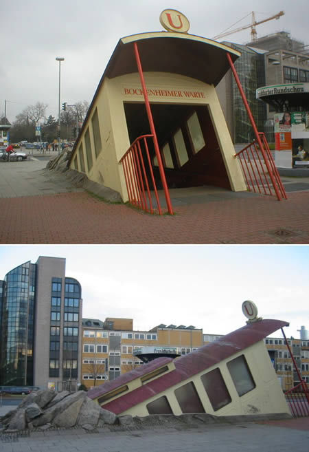 法兰克福的Bockenheimer Warte地铁站:Bockenheimer Warte地铁站位于法兰克福,具有奇怪的入口,好像一辆火车在人行道中间爆炸,并沉入地下。设计师称,他在设计时受到超现实主义艺术家的启发。