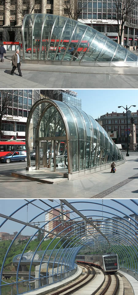 毕尔巴鄂地铁站(西班牙):西班牙巴斯克地区的毕尔巴鄂地铁站因交通系统的速度和效率,以及设计风格而为当地人所称道。毕尔巴鄂地铁站是由诺曼·福斯特(Norman Foster)设计的。毕尔巴鄂地铁站宽敞明亮。福斯特在设计时使用了梁、楼梯和灯光点缀,体现了一种简洁而明快的设计风格。如此设计更是独一无二,入口呈圆管状突出到街道地面上。