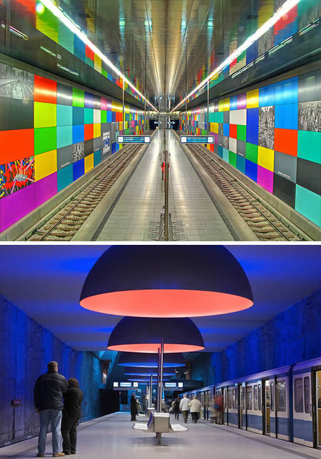 慕尼黑城市地铁(U-Bahn)(德国):慕尼黑公共交通系统非常出色,包括郊区火车、城市地铁、市内有轨电车和公交线路,把城市的每个部分完美的结合起来。这个地铁系统已经在1972年开放,站台干净漂亮。早期的地铁(上)设计上具有简约的风格,而后来的地铁(下)设计上增添了许多有趣的元素和一些艺术作品。