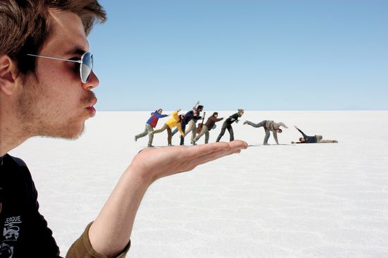 错觉摄影作为一种后现代主义艺术形式,其具有很强的后现代主义特点。虽然艺术家们在不断的探索艺术语言和思想内涵,但丝毫不影响错觉摄影本应该具有的个性、娱乐性、参与性、普及性等诸多后现代主义艺术的特征,错觉摄影给大众带来更多的是娱乐和轻松的生活态度。要说摆拍设局和后期合成这两种创作方法还有一定的技术门槛,那么强迫透视作为一种错觉摄影最常见的创作方法,其操作简便,已经越来越成为一种潮流,这股潮流已经从艺术家那里流向了大众娱乐领域。利用这种创作方法,人人都可以进行错觉摄影的创作,也许这就是后现代主义艺术的魅力所在。
