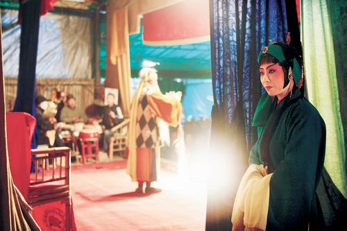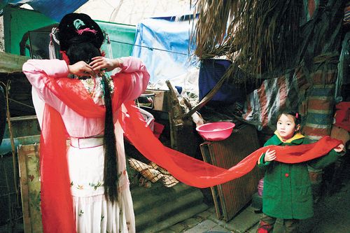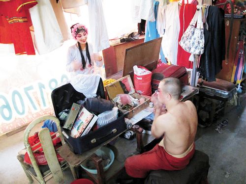 撩开帘子便来到后台,演员们正在化妆,穿着剧中某个朝代的服装,脸上画着一个经典故事里的人物脸谱;一头华丽的珠花伴着满面俏丽的妆容,身着的是发黄的T恤衫……站在露天的化妆间里,感受到的是他们的气息和属于他们的真实。戏装、靴子、头花或者散落在桌子上的粉盒和油彩……虽然凌乱但是又如此和谐,夏日阳光穿透帐篷斜射进来,与里面的道具、演员相互映照着,让人感觉到他们现在的生活,很辛苦、很“落伍”,但是他们仍旧乐观。