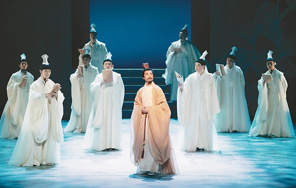 《南孔》的特色不仅是其文笔的洁净,结构的严整,更重要的是其在用音乐剧的手段表现历史的时候,着意的不是历史事件的发生过程、前后演绎,而是主要人物内心活动的变化、发展、跨越、逆转。这正是现代叙述方式的重要特征,也正是音乐剧艺术的魅力所在——让音乐充分戏剧性地刻画和描绘人物的内心世界。譬如,主人公孔洙,作为南孔第六代衍圣公,生逢乱世(元朝民族压迫深重,人分四等十级,汉人、南人最低,儒生低贱),他出场的第一段独唱就是“硝烟尽染残阳……/看破黑暗荒唐/是人心的光”。什么是“人心的光”?正如《论语·八佾》所说:“天下之无道也久矣,天将以夫子为木铎。”那么,孔子的思想又怎样才能成为那个时代人们的典范呢?这正是主人公在全剧所追寻的目标。