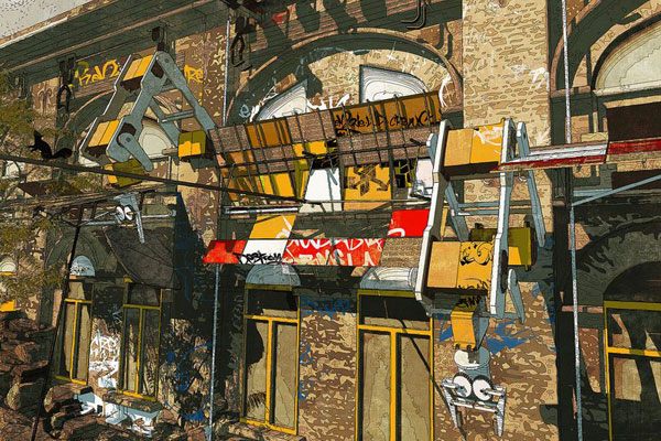 这些破旧的建筑立面作品出自艺术家Lekan Jeyifo,他来自布鲁克林,是一位三维渲染师与数码插画家。这个系列作品用三维的表现手法再现了一座城市中废弃的建筑立面,以及依附在立面上的破旧的设备设施。画面充满了科幻的色彩与丰富的设计细节,那些被腐蚀的设施好像还在运转,那些斑驳的墙面却在勉强地支撑着。