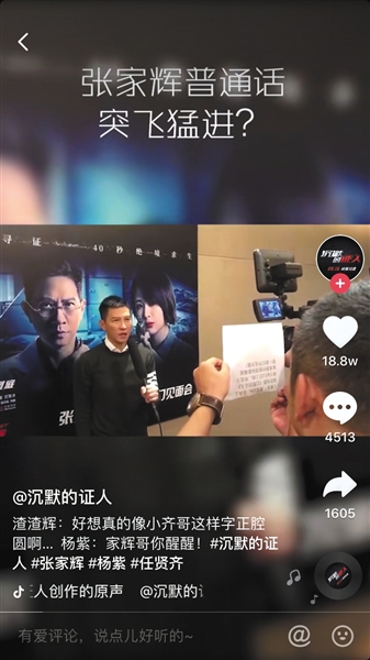 有一段张家辉站在镜头面前拿着话筒,只张嘴不出声念ID,另一位主演任贤齐在镜头外配音的视频,在抖音的获赞数为18.8万。而该片点赞率最高的则是在发布会上,张家辉不敢介绍自己的名字,与任贤齐互相介绍对方名字的视频,高达170.8万个赞。这一次同样是玩普通话梗,但是创新表现张家辉普通话“说得很好”这两个视频都上了抖音和微博的热搜。