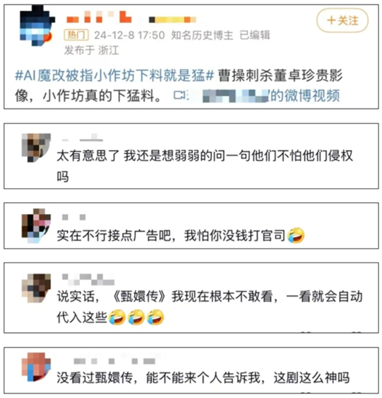 《管理提示》指出,近期,AI“魔改”视频以假乱真、“魔改”经典现象频发。如《甄嬛传》变身“枪战片”,《红楼梦》改成“武打戏”,孙悟空骑着摩托车扬长而去等。《管理提示》认为,这些视频为博流量,毫无边界亵渎经典IP,冲击传统文化认知,与原著精神内核相悖,且涉嫌构成侵权行为。