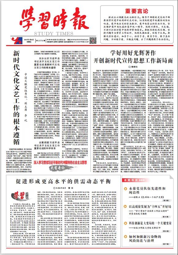 党的十九届五中全会明确提出了“十四五”时期文化建设的目标任务、基本途径、重要原则等,对提高社会文明程度、发展文化事业、衡量文化产业发展质量和水平等提出了一系列新观点新论断,为“十四五”时期乃至今后更长时期文化建设提供了基本遵循、指明了发展方向。我们一定要结合实际学、及时跟进学,全面深刻理解习近平总书记关于新时代文化文艺工作的重要论述精神,把学习贯彻《习近平谈治国理政》第三卷引向深入,推动新时代文化文艺工作繁荣发展,为实现中华民族伟大复兴的中国梦作出新的贡献。