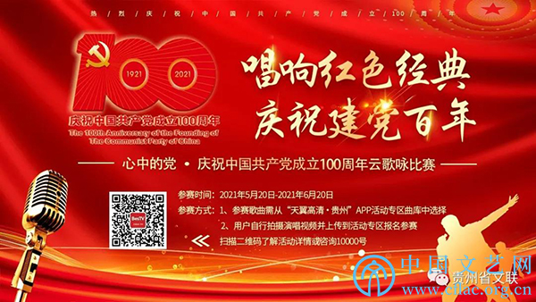 由贵州省文联、贵州省文化和旅游厅、贵州广播电视台主办的“心中的党——庆祝中国共产党成立100周年云歌咏比赛”现已开启。活动围绕庆祝中国共产党成立100周年,深入开展党史学习教育,学党史、唱红歌,传承红色基因,讲好党的故事。