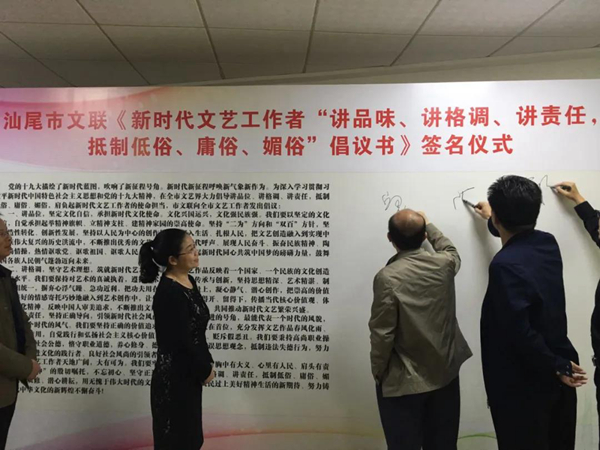 广东省汕尾市文联《新时代文艺工作者“讲品位、讲格调、讲责任,抵制低俗、庸俗、媚俗”倡议书》签名仪式现场