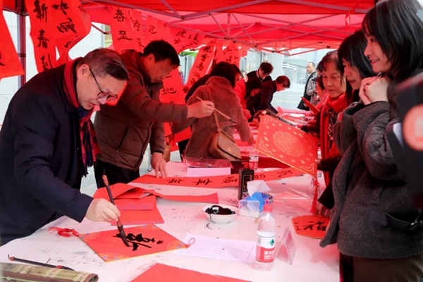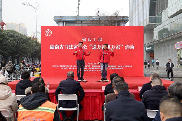 1月16日,湖南省文联春联艺术“百千万”光大工程活动在长沙市芙蓉区佳兆业广场前坪启动。湖南省文联党组成员、副主席张纯,湖南省文联党组成员、副主席倪文华,长沙市芙蓉区委常委、宣传部部长赵雪峰,芙蓉区委宣传部常务副部长李启杰,五里牌街道党工委副书记、办事处主任钟泽平,湖南省书法家协会、湖南省楹联家协会、湖南省文艺志愿者协会的艺术家,湖南省文联机关、芙蓉区、五里牌街道、燕山街社区干部职工,先进工作者代表、环卫工人代表、快递小哥代表和社区群众代表共200余人参加活动。启动仪式由倪文华主持。