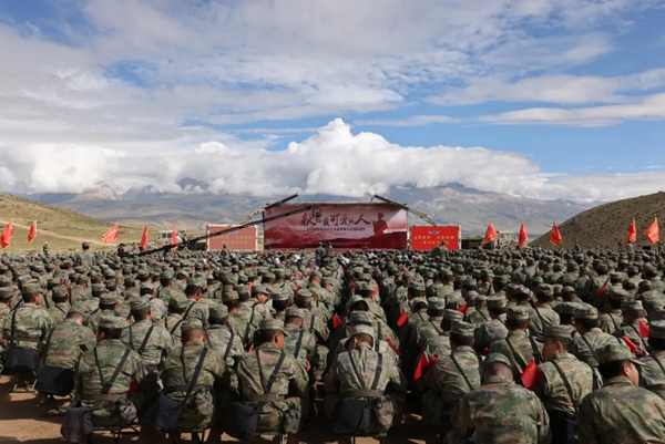 8月20日7时30分,在海拔4000多米高原上的西藏军区某训练场,写着标语的红色横幅正在阳光下随风舞动。