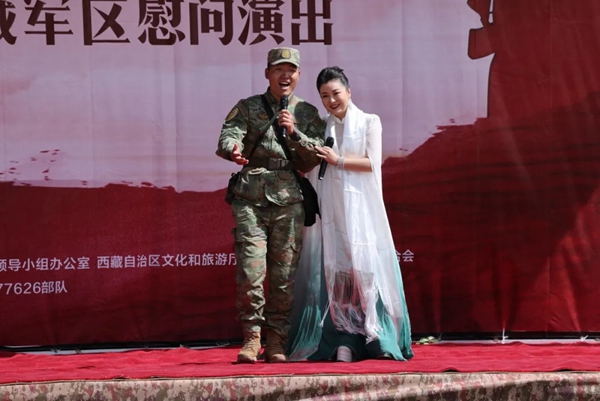 演出中,艺术家们不时走到台下和战士们互动,还邀请了几位战士上台共同演出,无论是共唱黄梅戏《天仙配》选段,还是参与到小品《摄影爱好者》的互动中来,都给在雪域高原戍边卫国的战士们带来了难忘的体验,现场的掌声和笑声不绝于耳。