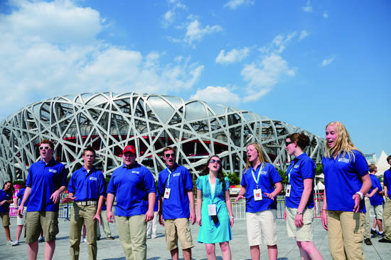 In Beijing, the Troupe visited Summer Palace, climbed on the Great Wall, and sang or danced in Bird Nest and Water Cube where the motto “One World One Dream” was realized. They even entered Taoranting Park to feel vividly the morning exercise of senior citizen in Beijing. In Hohhot, they were deeply moved by warm welcome and hospitality by the people in Huiteng Xile Grassland. There cloudlike herd of sheep and poles of windmill showcased the magnificent development of new energy. In Fuyang, Zhejiang Province, American young artists not only appreciated the in-depth deposit of Chinese traditional culture in Ancient Longmen Town but also witness the prosperity of New Rural Construction in Huang Gongwang Village.