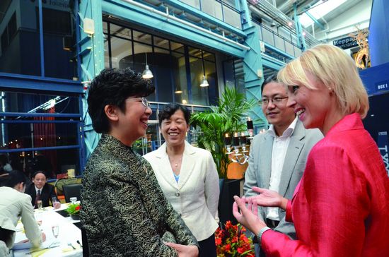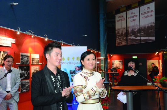 赵实在今日中国电影展映开幕典礼上向“今日中国”艺术周韦斯特罗斯市组委会主席雅布隆斯基的夫人佩查了解瑞典的电影和文化