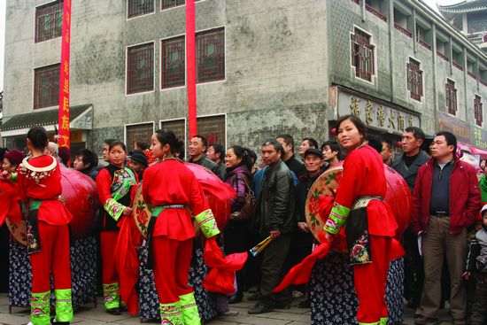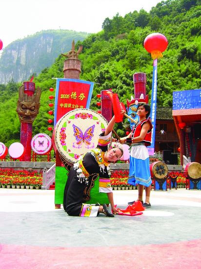 Xiangxi Tujia and Miao Autonomous Prefecture is the place where minor nationalities of Hunan Province are mostly concentrated. Every girl of Dehong Miao Village begins to learn the drum beating since her 6 or 7 years old. Drum is also the best playmate for those children who lack the entertainment in deep mountains. Because of the addiction to Miao drums and the painstaking practices in skills and innovation, the drum dancing artists of Dehong Miao Village win the championship in all the Drum Cultural Festival and the Competition of Miao Drum at the Minor Nationality Sports Games since the foundation of new China.
