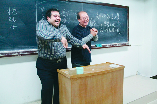 In the afternoon of every Saturday, a classroom of Beijing University of Chemical Technology will be filled with laughs. The young men from Switzerland, U.S., Russia, Romania, Iran and Vietnam come to the platform and perform the traditional forms of comic dialogue, viz. clapper, rhythmic storytelling, monologue and crosstalk. Standing in front of the platform, Ding Guangquan tapped the rhythm on the table for disciples. While pointing out their shortcomings and progress, he instructed the standing position and gestures of two crosstalk performers, the skill of provoking various laughers, the rhythm of clapper and storytelling. In the eyes of Ding, crosstalk must be treated as the academic study as well; even those foreigners must be professional in performing crosstalk. “We come to know our ignorance only when we are studying and vice versa.” He often told disciples that “We should seriously treat such an art containing rich cultural connotations.”