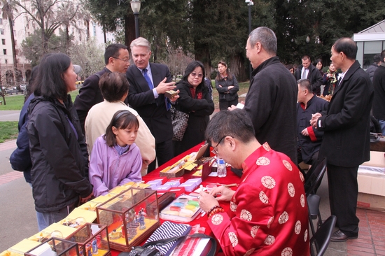 位于美国加州中部萨克拉门托市是加州的州府所在地,人口只有几十万,环境优美,气质优雅。文化周的开幕式朴素但庄重,热烈却不喧嚣,没有宣传,没有召集,没有吆喝,开幕式后,中国民间工艺家在不同区域内安静地开始了自己的创作和展示,一切都没有刻意安排。刚开始,只有三三两两的上班族静静地走过,偶尔会带着好奇的一瞥。但不一会儿,中国传统工艺散发的魅力让热情的美国人开始聚拢了过来,好奇地打量,小声地询问,面对京剧脸谱、皮影、糖画等,很多人甚至想跃跃欲试。邓立丰表示:“我们做了很多大大小小的各类中美间文化交流活动,一直以来就觉得中国有太多太多的好东西需要我们去弘扬,需要让美国其他族裔的人群看到、了解到、认识到真正的中国文化。”