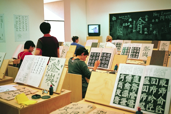 Square Word Calligraphy Classroom, (mixed media installation, dimensions variable). Installation view, Institute of Contemporary Art, London (1997). Courtesy XU Bing Studio.