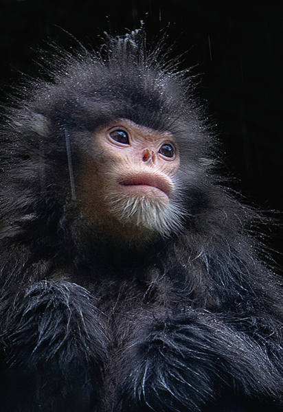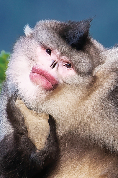 Xue Kang has committed his enthusiasm , warmth , cheerfulness and optimism to the camera, leaving beautiful images for each of the cute golden monkeys. In the work Hunger, four golden monkeys with brown heads and gray backs are clustered together. The group sits on a large rock, their eyes looking into the distance, full of expectation; the Green Home reflects the living habits of golden monkeys - they choose branches depending on the scale of family, as different families of golden monkeys sit on different branches of a large tree; In Mother and Child, a small golden monkey held by his mother is as peaceful as a baby; the thick cherryred lips of the only Yunnan snub-nosed monkey alone in the forest in the work of Beauty is particularly eye-catching; The Elf is a close-up shot of the golden snub-nosed monkey, the environment is blurred into a background image with colors of blue and white, reflecting the pretty hair of the cute animal perching on the dead branches, with watery eyes amid tranquility.