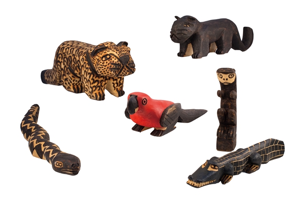 Handmade sculpture of Mbyaguarani: jaguar, jaguar, snake, parrot, monkey, caiman