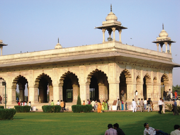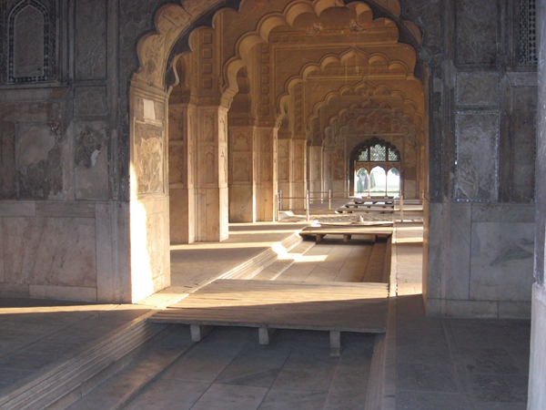 穿过拉合尔门后的甬道,便可看见红堡的外宫——觐见宫。觐见宫由正面9个、两侧各3个拱门依次相连而成,形成了除内墙外三面开放的长方形格局,是沙贾汗王当年亲理朝政和接见百姓之地。现在宫殿内墙中央还矗立着沙贾汗当年坐过的大理石宝座,宝座上精致的花鸟、树木等浮雕,诉说着王国昔日的传奇。