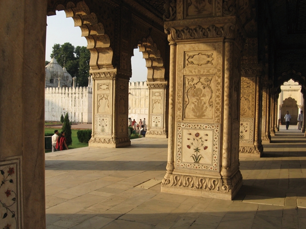 从沙贾汗的寝宫中走出,面向红堡粗犷的砂岩外墙,不禁想起了他对红堡的比喻——“就像一个美丽女子的面纱”。当他下令修建这连绵坚实的红色外墙时,那一刻,是不是有股暖流触及他内心的温柔角落?当他在阿格拉堡的窗口眺望远处的泰姬陵时,又有怎样的心绪在千回百转。在那颗被痛苦折磨的心灵里,遮敝着一个不为人知的世界,那里有霸道、有厮杀,也有痴情和缱绻。一片宫墙,把那个为柔情留下的空间掩盖起来。游人来来去去,瞻仰了那么多年,窥视了那么多年,今天,沙贾汗的宫室最深处仍是封闭的。他把最私密的位置保护起来,轻易不示人。寝宫顶上每一个看似杂乱的石刻,都是只有他和泰姬才能明白的奥秘,见证着他们一脉温情的自享与企盼。