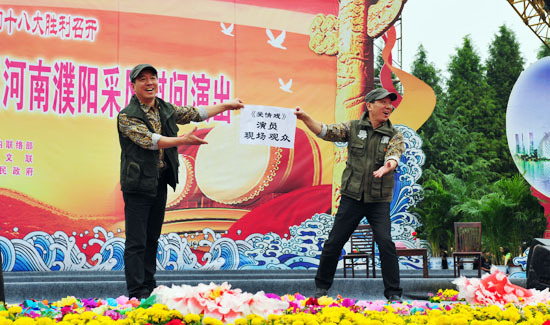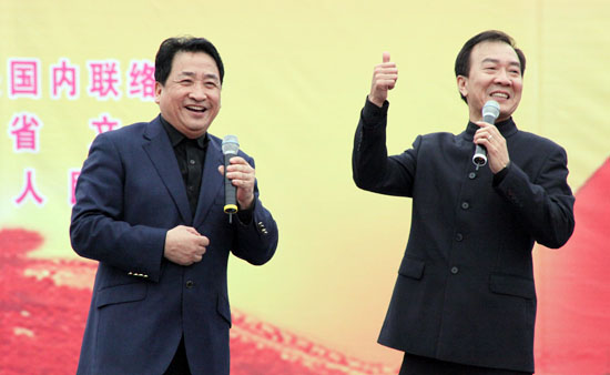 演出在濮阳市杂技艺术学校、濮阳市杂技团等表演的歌舞《龙腾神州》的喜庆旋律中拉开帷幕。姜昆与戴志诚合说的相声《欢歌笑语》,姜克美表演的京胡独奏《夜深沉》,中国杂技团有限公司带来的杂技《俏花旦——抖空竹》,刘兰芳演出的评书《张飞请孔明》,汪荃珍演唱的豫剧《抬花轿》选段,遂宁市杂技团演出的杂技《比翼——双人倒立技巧》,高保利演唱的《山丹丹开花红艳艳》,刘全和、刘全利带来的滑稽小品《兄弟拍电影》,焦健东、石磊表演的口技,济南市杂技团演出的《空中彩绸》,李彦培带来的《变脸》,殷秀梅演唱的《在希望的田野上》以及她与毋攀合唱的《走向复兴》等节目,在牛群、鞠萍幽默诙谐的主持串联下一一奉上。台上演员卖力地演出,台下观众们脸上洋溢着开心的笑容,这些观众来自濮阳的各行各业,有石油工人,有医护人员,有公安干警,有老师和学生,有农民、外来务工人员……而坐在观众席第一排身披红色绶带的老红军、优秀党员、道德模范和劳动模范,尤为抢眼。最后,演出在现场两万余人共同高歌《歌唱祖国》的壮观景象中落下帷幕。“看了今天的演出,我的心情可以用一句歌词来形容:咱老百姓今儿个真高兴!”濮阳市人民医院的小张护士脸上露出一个大大的笑容。