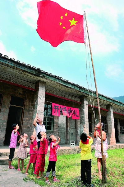 在湖南省保靖县山区,湖南日报记者采访一位驻守深山33年的老师。图为记者镜头下大山里的升旗仪式。