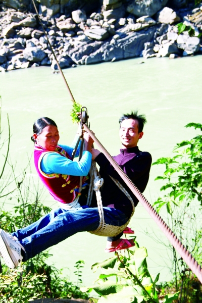 人民日报记者(右)在云南省怒江傈僳族自治州采访“溜索改桥”工程。
