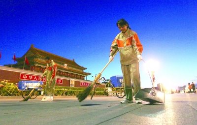 凌晨4点30分,北京日报记者拍摄到在天安门地区进行保洁工作的两位环卫工人。