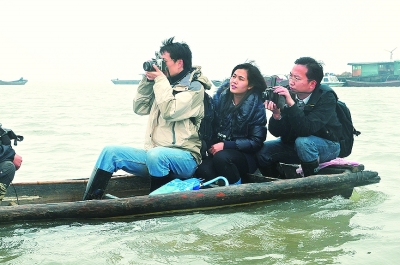 光明日报记者历时11天、跨越5省,深入我国基层水文站调研。图为三位记者在鄱阳湖采访。