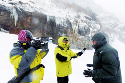 新华社记者在遭受特大雪灾的日喀则地区受阻路段采访。