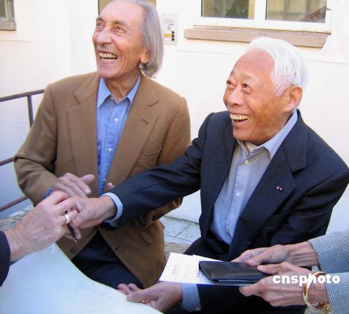 资料图:法籍华人绘画大师赵无极画展2007年10月6日在法国勒莫尔市的博物馆城堡开幕,展出赵无极60余件绘画珍品,包括油画和水墨作品,时间跨度长达60年。当日,来自四面八方的人群在城堡外排起长龙,争相一睹这位东方艺术大师的风采。图为赵无极在展览现场。