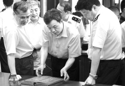 文化部副部长项兆伦(左一)等在观赏移交的文物。 谌强摄