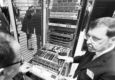 2013年3月德国汉诺威IT展戴尔公司展台,工作人员向参观者介绍大型服务器。新华社发