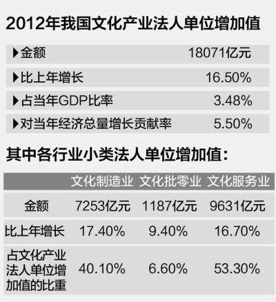 国家统计局今天公布数据显示:2012年我国文化及相关产业法人单位增加值达18071亿元。文化产业对当年经济总量增长的贡献为5.5%。
