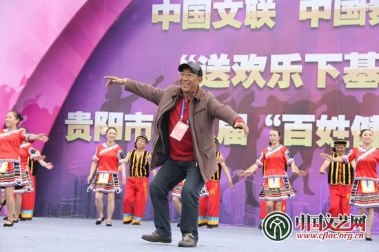 已过花甲之年的中国舞协副主席丹增贡布和云岩区云飞社区舞蹈一队同舞《吉祥谣》,东北“小辣椒”、中国舞协副主席王小燕用热辣的东北秧歌和贵州省文化馆舞蹈队共舞《天天好时光》……最后,中国舞协名誉主席白淑湘,中国舞协分党组书记、驻会副主席冯双白等与台上台下共舞,踏响同一节拍。