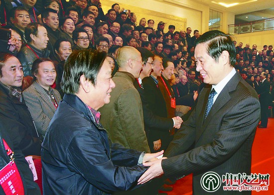 11月25日,中国美术家协会第八次全国代表大会在京开幕。中共中央政治局委员、中央书记处书记、中宣部部长刘奇葆(右)亲切接见与会代表 中国文艺网 孟祥宁 摄