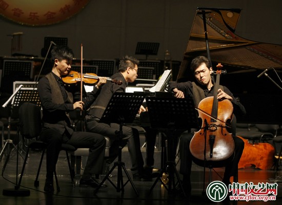 获得器乐(钢琴与弦乐组合)金奖的上海音乐学院的棱境组合(张润崯、耿文彬 、朱宛晨)现场表演 张大勇摄