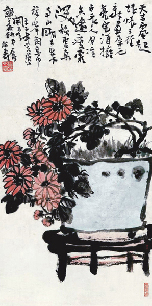 首开精品拍卖夜场先河的“流觞——名家精萃晚场拍卖”是本期拍卖的拳头产品。15件作品成交14件,总成交额达2875万元,表现堪称完美。其中周佛海旧藏并题签的齐白石《菊寿图》、齐白石赠其弟子胡佩衡亲戚仲孚的《吾家栗树》均系齐氏精工刻写的各题材佳构,两件最终分别以149.5万、276万元成交。张大千发抒思乡病的《春山萧寺》虽不足三平尺,但其小泼彩之用相当完美,终以299万元易主。傅抱石赠戴星明的《云岭风烟》和李可染出版于权威的《东方既白》中的《绿荫闲话》亦分别以333.5万和264.5万元成交,显示了一线大家不同寻常的市场号召力。董寿平尺幅巨大的《松寿万年》笔墨苍劲,以125万落槌,连佣金计143.75万元。蒋介石挽梅贻琦之《楷书“勋昭作育”》为台湾清华大学梅氏墓碑所镌原作,十分珍罕,也以100万元敲槌。
