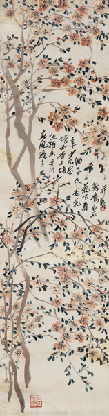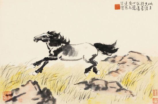 齐白石、潘天寿等领衔的近现代大家阵线表现仍旧相当抢眼。潘天寿《冷香黄菊图》为其1933年赠韫华所作,笔墨间尚有缶老的影子,属其个性化尚未完全成熟之作,虽仅二平尺余,但却以310.5万元成交;齐白石忘年交旧藏的《杏花花下》系其衰年变法前夕之作,亦以92万元易主;而张大千《策杖寻诗》则属其四十年代偶效早期仿石涛山水之制,打点及皴擦之法均极臻妙境,亦斩获92万元。此外,广东名家翁镇希旧藏的徐悲鸿《奔马》、于非闇赠原国民党中将龚浩的《牡丹》均一平尺余,终以115万、78.2万元成交。