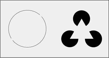图7.左边显示的是一个圆,有两个断口。我们眼睛不会把这个图形当成两个半圆,而直接会把它看成一个封闭的圆;这叫封闭律。图7.右边大家都会看到一个三角形;而其实三角形根本不存在。这是由于封闭律的作用,所以人人都「看」到了这个不存在的三角形。