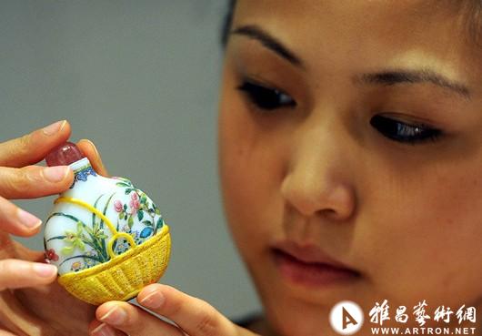 5月23日,清乾隆御制料胎画珐琅“花篮式”鼻烟壶(估价:28万至36万美元)在传媒预展上展示。香港苏富比即将举行中国工艺品拍卖会。中新社发 谭达明 摄