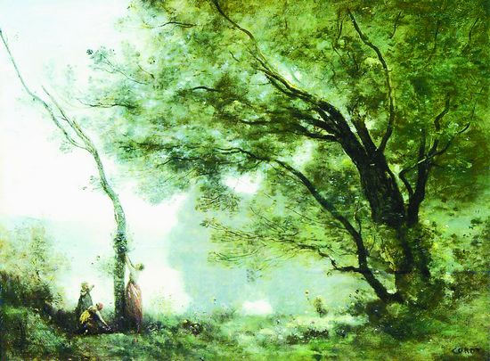 那年的夏季,我和我的朋友就是这样一边谈论着柯罗一边在颍河的河道里航行的。就像柯罗本人一样,我们学习着从大自然里、从迷人的乡村风光里寻找着从柯罗的笔触里呈现出来的那些浅蓝色的、那些浅绿色的、那些淡棕色的、那些银灰色的梦境,我们跟柯罗学习着在现实生活中寻找着大自然遗落在乡村的梦境。柯罗喜欢过着温和沉静的农民似的生活。柯罗同我们一样喜欢在夏季里出外旅行。从1828年起,柯罗就开始在法国各地享受大自然,在诺曼底、在庇卞底、在勃艮第、在巴黎附近的桑利斯、在巴黎郊区的枫丹白露森林边上的风景如画的巴比松村,他都深深地领会到了大自然美妙的旋律,从此他开始给我们讲述着有关乡村的梦境的故事。自然的景色在进入了他的画面之后都具有了一种梦幻般沉思的特色,自然之物在他的笔下都被笼罩在透明的薄雾里。在颍河航行的木船上,我一次又一次被柯罗的精神所感动,面对他的《孟特芳丹的回忆》,面对他的《芒特的嫩叶》,久久不能清醒。当清晨来临的时候,面对着颍河两岸清新的像山坡一样隆起的柳树林和飘浮着水汽的河面,我企图通过柯罗的眼睛来感受我熟悉的乡村。这就是我的颍河吗?这条清秀如梦境一样的河流和远在桑利斯的孟特芳丹有什么不同呢?岸边码头上蹲着洗衣的少妇们细腰肥臀,黑缎一样的长发绾在她们的头上,淡青色波动着的河水里倒映着她们的梦一样的身影,棒槌捣衣的回声一下又一下从河对岸传过来,她们偶尔停住,用湿漉漉的手指撩一下垂在额头上的散发……我的天呀,那是一种怎样的动人的乡村情怀呀,这和那个远在孟特芳丹湖边树林里的身穿红色衣裙仰头举手采摘着树上草蕈的妇女有着什么不同呢?没有,作为有情感的人,她们同样装点了我们的现实和梦境之中的风景。因为有了柯罗,我们在面对大自然里的乡村的时候,才有了一种身置梦境里的感觉。因为有了梦,我们的生活才这样富有诗意!