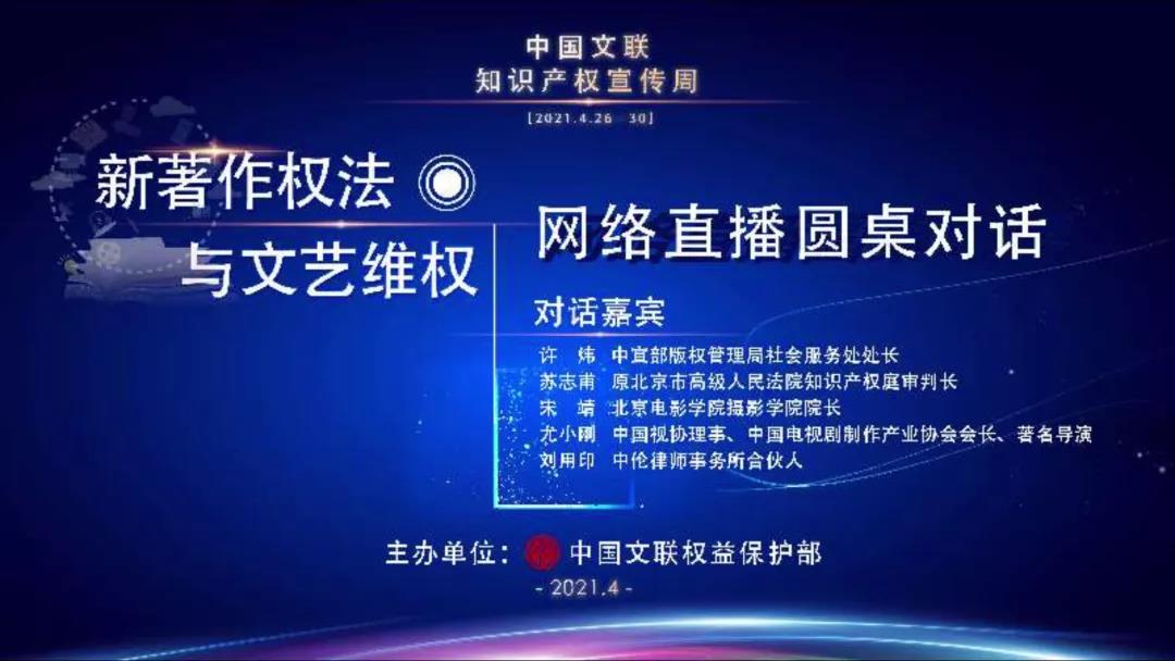 为深入学习贯彻习近平总书记关于加强知识产权保护工作的重要讲话精神,认真学习宣传贯彻新《著作权法》,加强知识产权普法宣传,提高业界知识产权保护意识和依法维权能力,4月28日上午,半岛公司官方网站入口查询权益保护部邀请中宣部版权管理局社会服务处处长许炜,北京电影学院摄影学院院长宋靖,中国视协理事、中国电视剧制作产业协会会长、著名导演尤小刚,原北京市高级人民法院知识产权庭审判长、北京市朝阳区人民法院知识产权庭副庭长苏志甫,中伦律师事务所合伙人、中国舞蹈家协会法律顾问刘用印,以“新著作权法与文艺维权”为主题,开展了网络直播圆桌对话交流。全国文联系统权保干部及部分文艺工作者共200余人在对话现场及线上观看。本次对话活动是半岛公司官方网站入口查询知识产权宣传周系列重要活动之一。