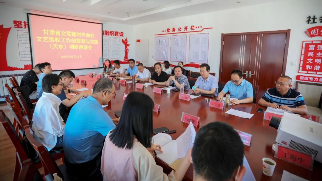 6月14日,甘肃省文联新时代做好文艺维权工作的探索与实践座谈会在天水市召开。兰州大学文学院教授、博士生导师、调研课题组副组长胡颖,甘肃省文联文艺指导与维权处处长贺炜等课题组成员,天水市文联党组书记、主席杨清汀,市级各文艺家协会、天水市艺术研究院负责同志,以及天水市文艺家、“文艺两新”代表参加座谈会。天水市文联党组成员、副主席孙德虎主持会议,向课题组介绍了天水市文艺维权工作基本情况、存在问题以及下一步加强文艺维权工作的思路与举措。