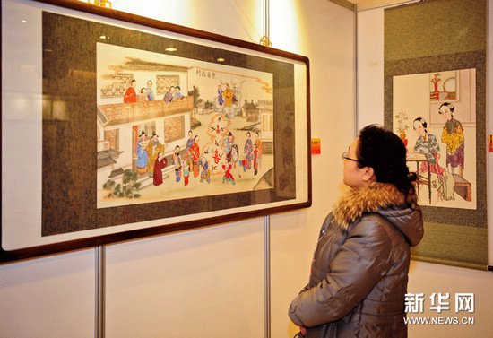 当日,民间杨柳青木板年画、剪纸艺术展在天津市和平区南市街庆有西里社区南市楼门文化展览馆向社区居民开放展出,汇聚了天津杨柳青木板年画、天津剪纸百余幅精美作品。新华网图片 张超群 摄