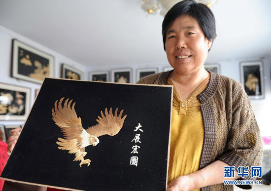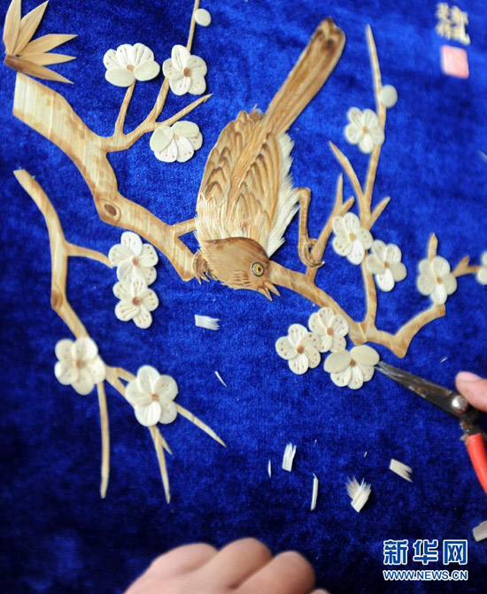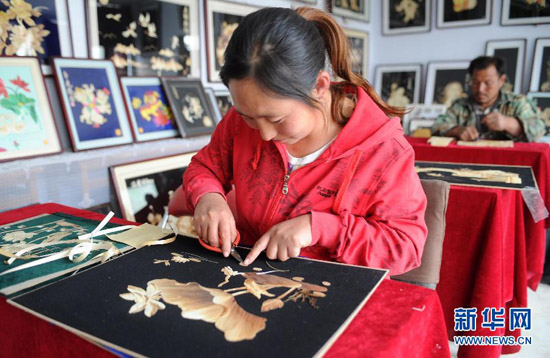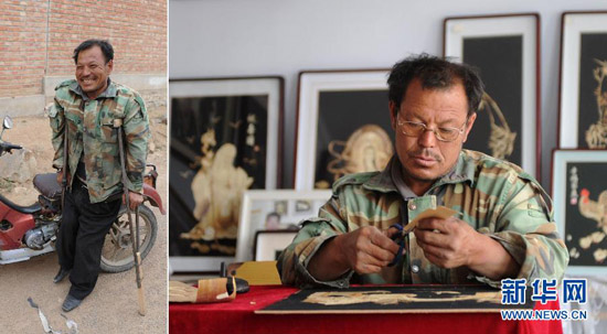 58岁的郭凤芝是河北丰宁满族自治县的一位下岗工人,19年前因患病致四级听力残疾。2001年,有美术功底的她开始尝试用野草、高粱、玉米等植物秸秆制作秸秆画。历经3年钻研,她将秸秆画的主要材料定位于玉米秸秆。经过清洗、漂白、消毒、劈剥、熏蒸、粘贴等工序,采用裁剪、雕刻、薰烫等多种技法,不起眼的玉米秸秆变成了精美的秸秆画。如今,郭凤芝的秸秆画已经远销新加坡、韩国等地,她还带出了30多位徒弟,他们大多都是残疾人、下岗失业人员和享受最低生活保障人员,每名弟子的月收入都超过1500元。郭凤芝说:“身残志坚,一样能致富。我的梦想是让残疾人和生活困难的朋友掌握一技之长来改善自己的生活。” 新华社发(王晓摄)