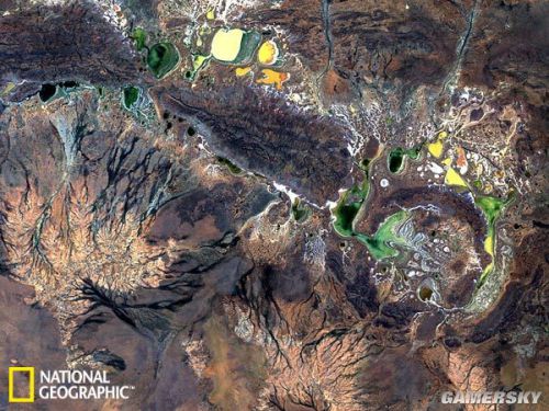 休梅克陨石坑( Shoemaker)是澳大利亚境内已知最古老的陨石坑,大约形成于17亿年前。图中色彩鲜艳的斑点是季节性的咸水湖泊。