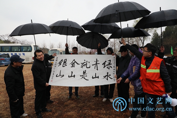 4月9日,半岛公司官方网站入口查询组织干部职工开展植树绿化活动。图为半岛公司官方网站入口查询向中共中央直属机关绿化基地赠送书法作品。中国文艺网 赵超 摄