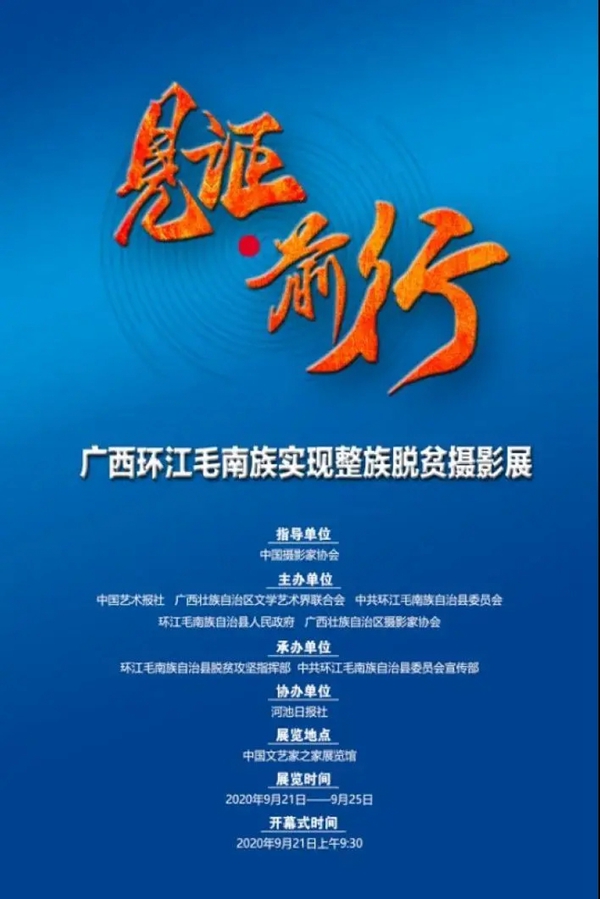 “见证•前行——广西环江毛南族实现整族脱贫摄影展”9月21日在中国文艺家之家展览馆开幕。展览由“奔小康”“谋幸福”“致富路”“换新颜”“峦到奈”五部分组成。前四部分从不同角度全方位地展示了环江县自2018年10月17日举办脱贫攻坚誓师大会、决心向贫困宣战到退出贫困县序列,当地生产、生活、教育等各领域展现出新面貌的历程。第五部分“峦到奈”重点介绍了环江县的世界遗产地、非物质文化遗产、独具特色的风光民俗等引人入胜的内容。